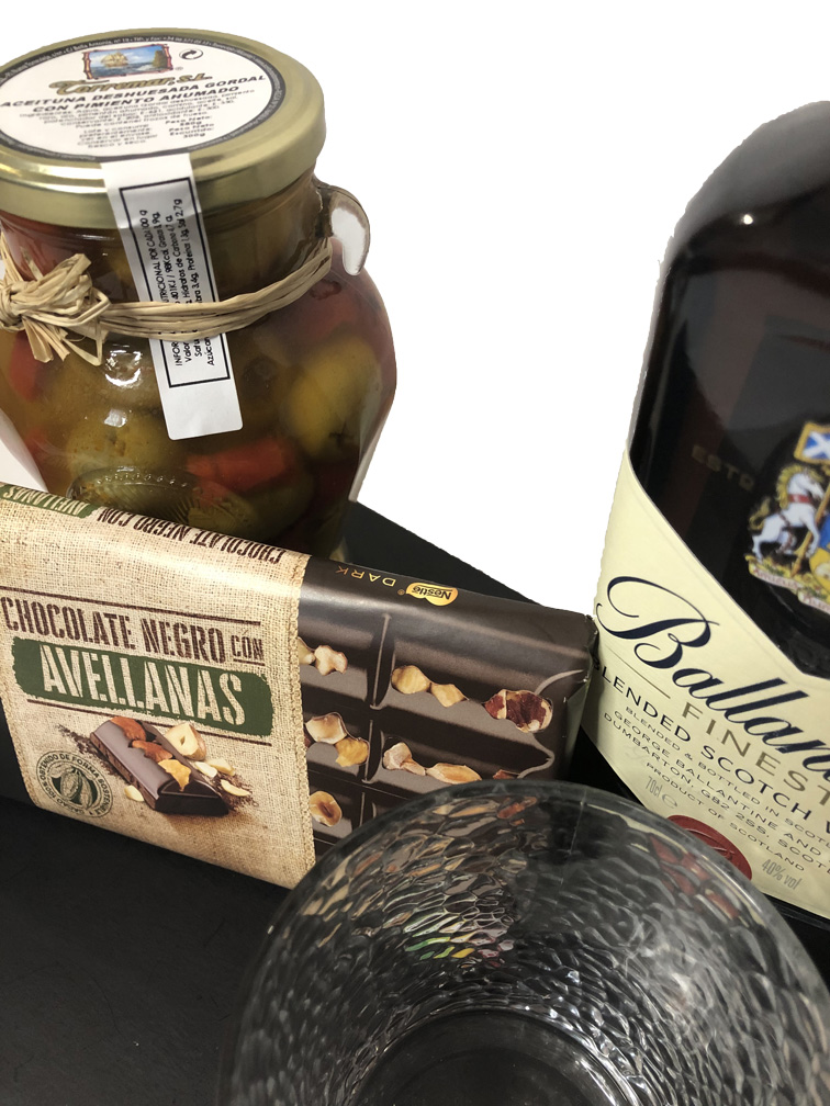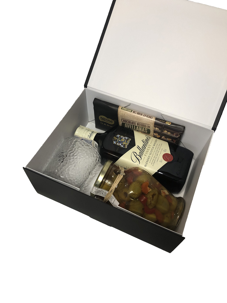 Me ha encantado la caja, muy elegante y sofisticada. El whisky Ballantines Finest es excelente, y el vaso es muy bonito. El chocolate y las aceitunas son un plus.