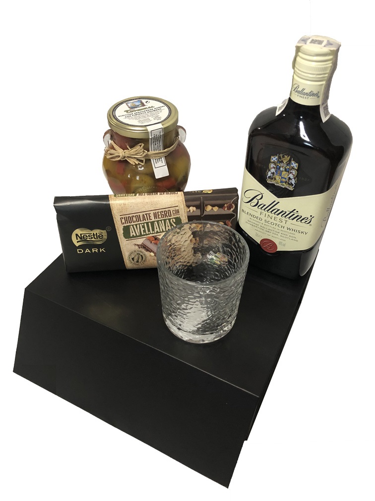Me parece un detalle muy elegante. El whisky Ballantines Finest es de mi agrado, y el vaso whiskero es muy original. El chocolate y las aceitunas son el complemento perfecto.
