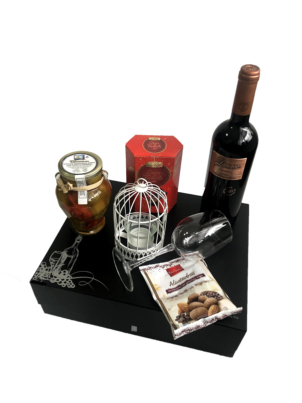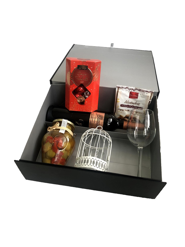 Me encantó la caja negra que me regaló mi novio para San Valentín. El vino tinto era delicioso y los bombones eran muy ricos. La copa, las almendras y las aceitunas le daban un toque elegante y el adorno de la jaulita de metal era muy bonito. Fue un detalle muy romántico y original.