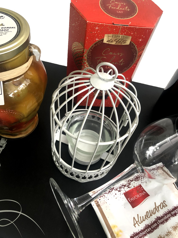 Me pareció original la caja que me regaló mi amiga para Nochevieja. El vino tinto era de una marca que me sorprendió y los bombones eran muy ricos. El adorno de la jaulita de metal era muy simpatico.